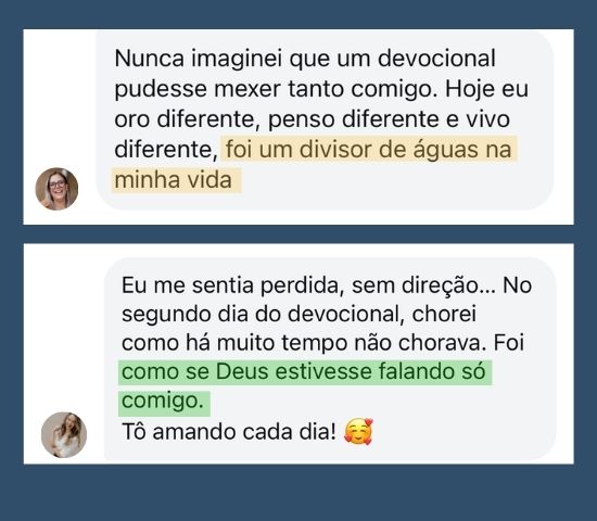 Não! Os devocionais são objetivos e profundos. Com 10 a 15 minutos por dia, você consegue fazer sua leitura, refletir, anotar e orar. É um tempo rápido, mas extremamente transformador.